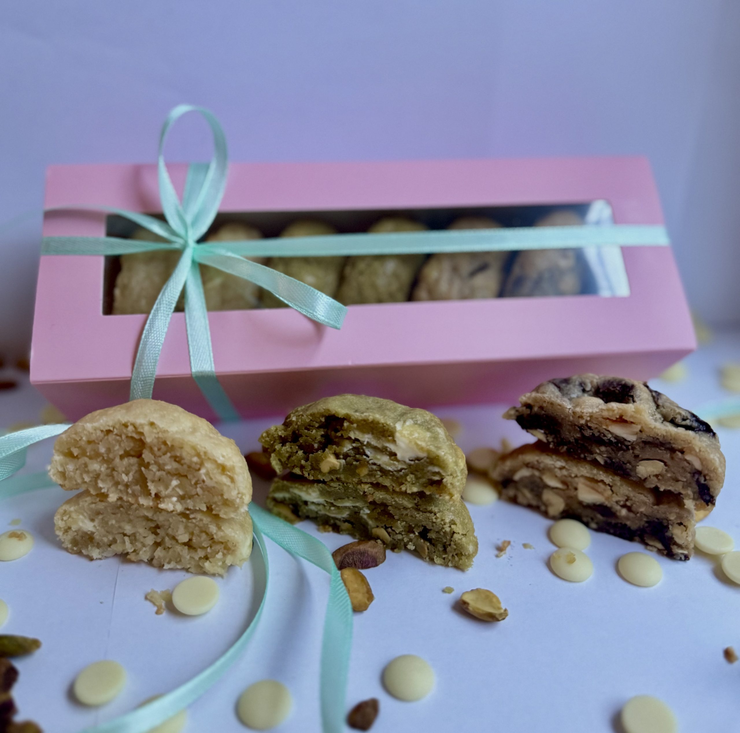 SLOŽENÍ: mouka, máslo, vejce, třtinový cukr, bílý cukr, vanilka, sůl, kypřící prášek, Velvet bílá čokoláda, ořechy (pistácie) / Výrobek muže obsahovat stopy jiných skořápkových plodů.