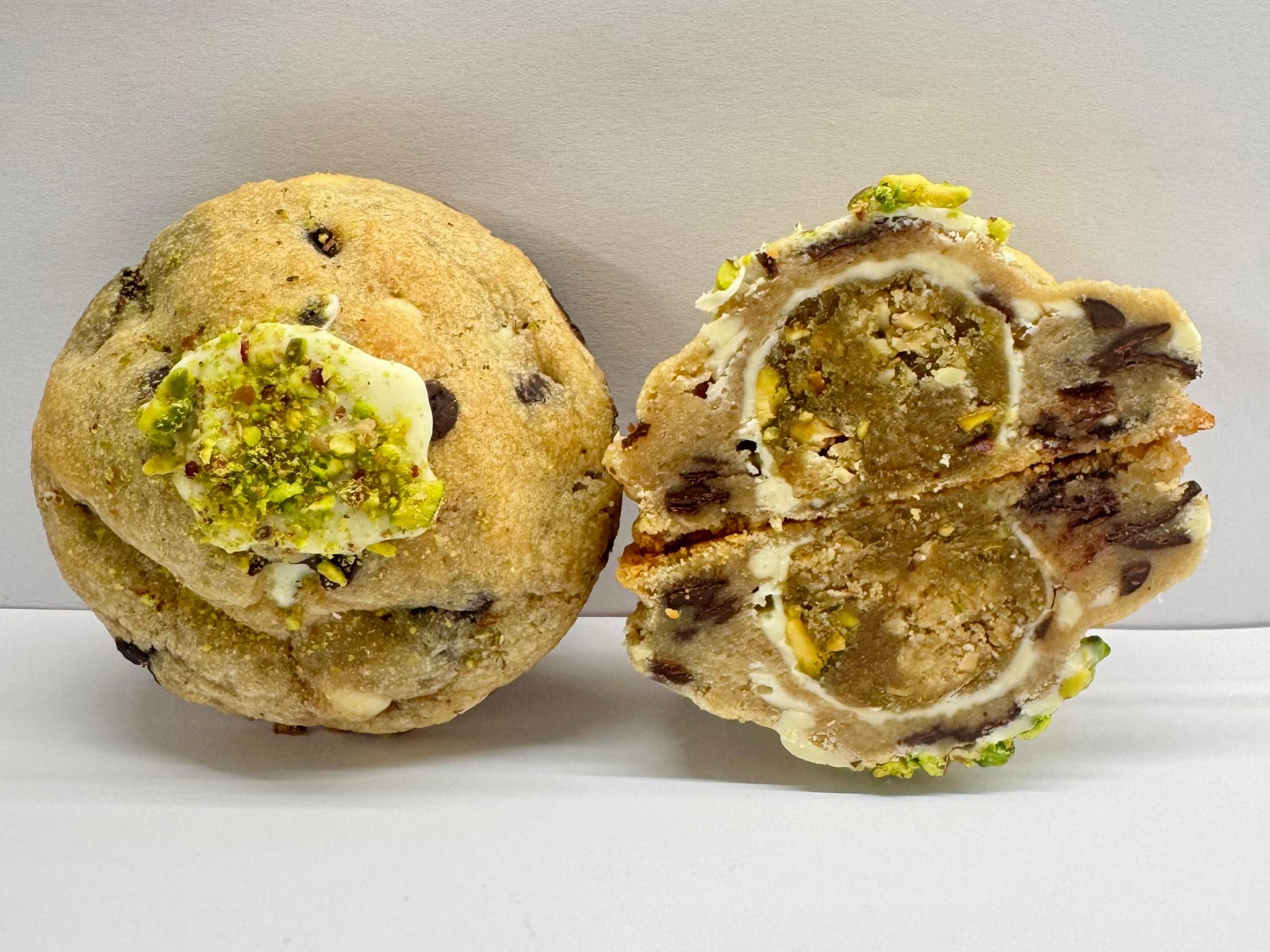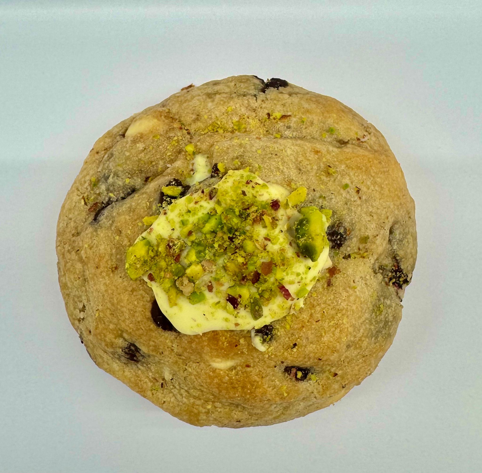 SLOŽENÍ: mouka, máslo, vejce, třtinový cukr, bílý cukr, vanilka, sůl, kypřící prášek, Velvet bílá čokoláda, čokoláda 60%, smetana, pistácie.