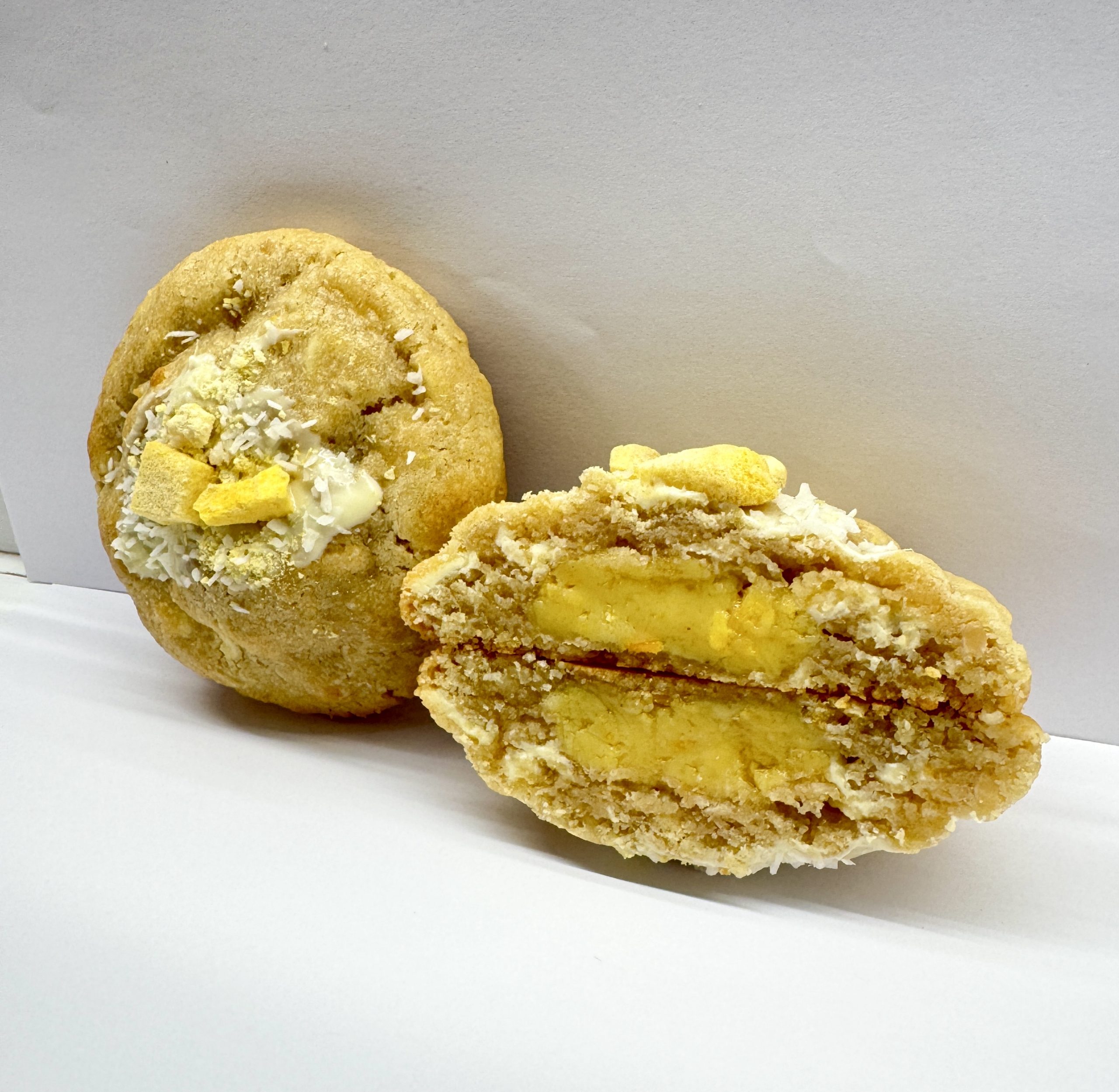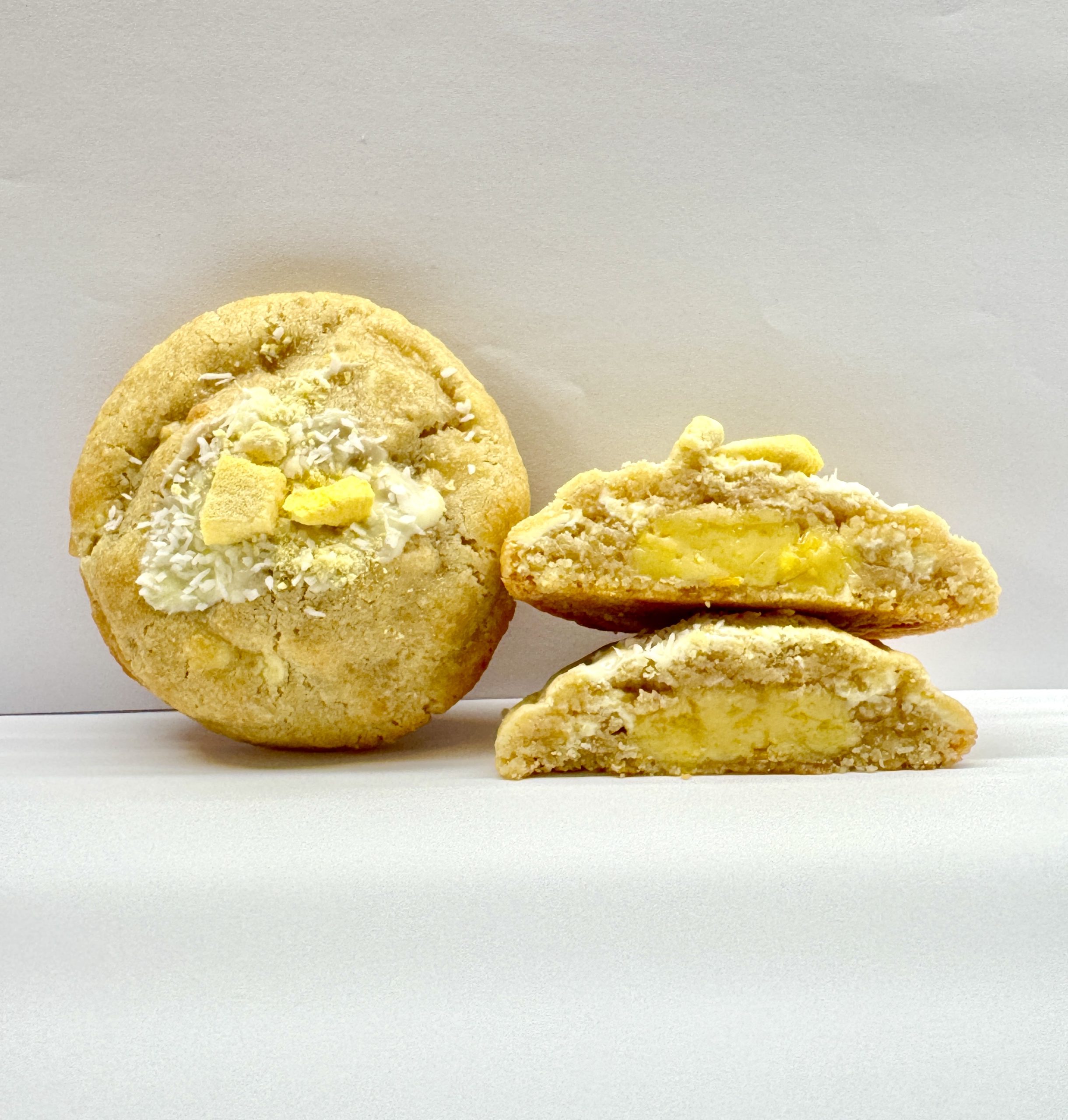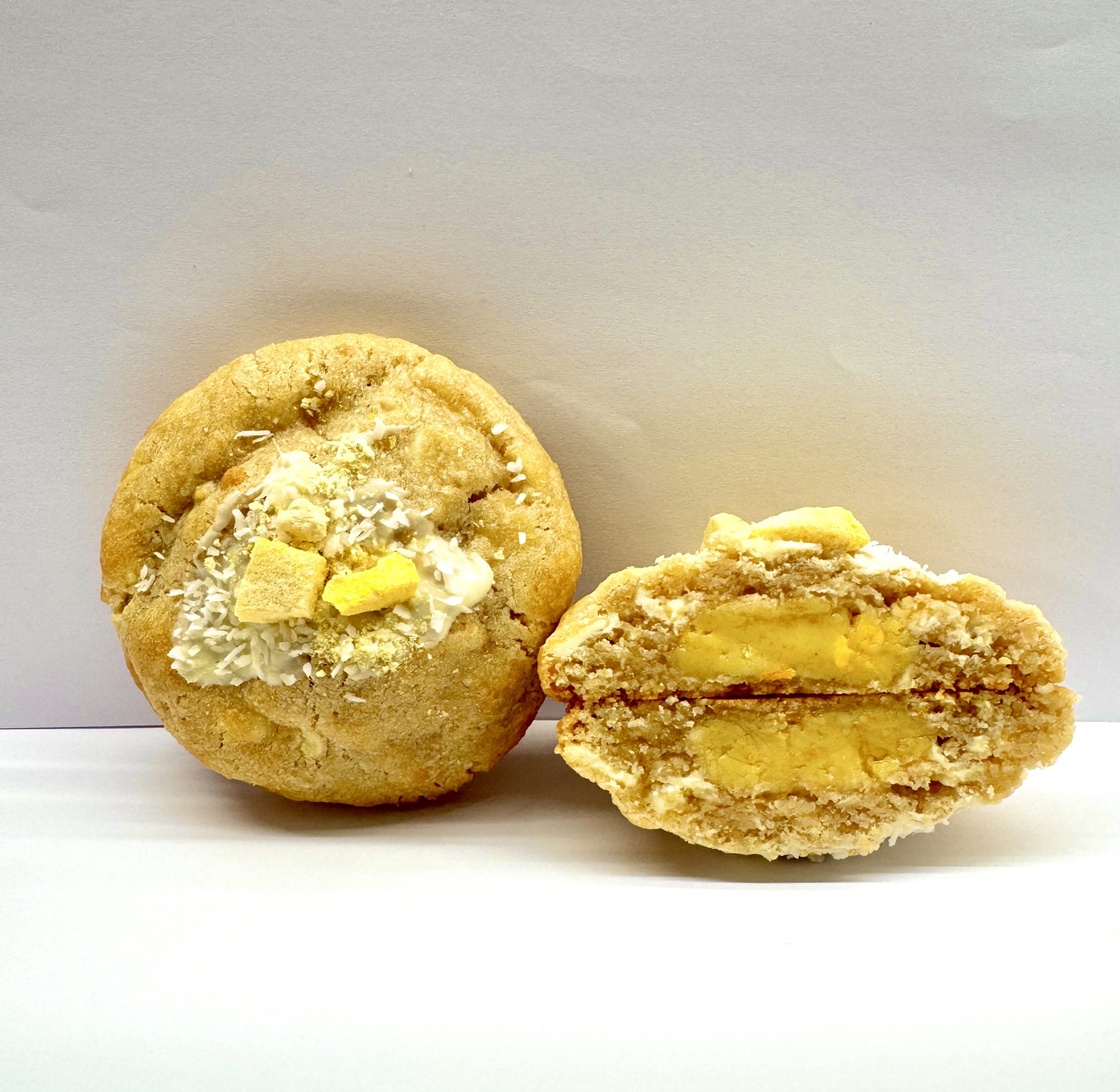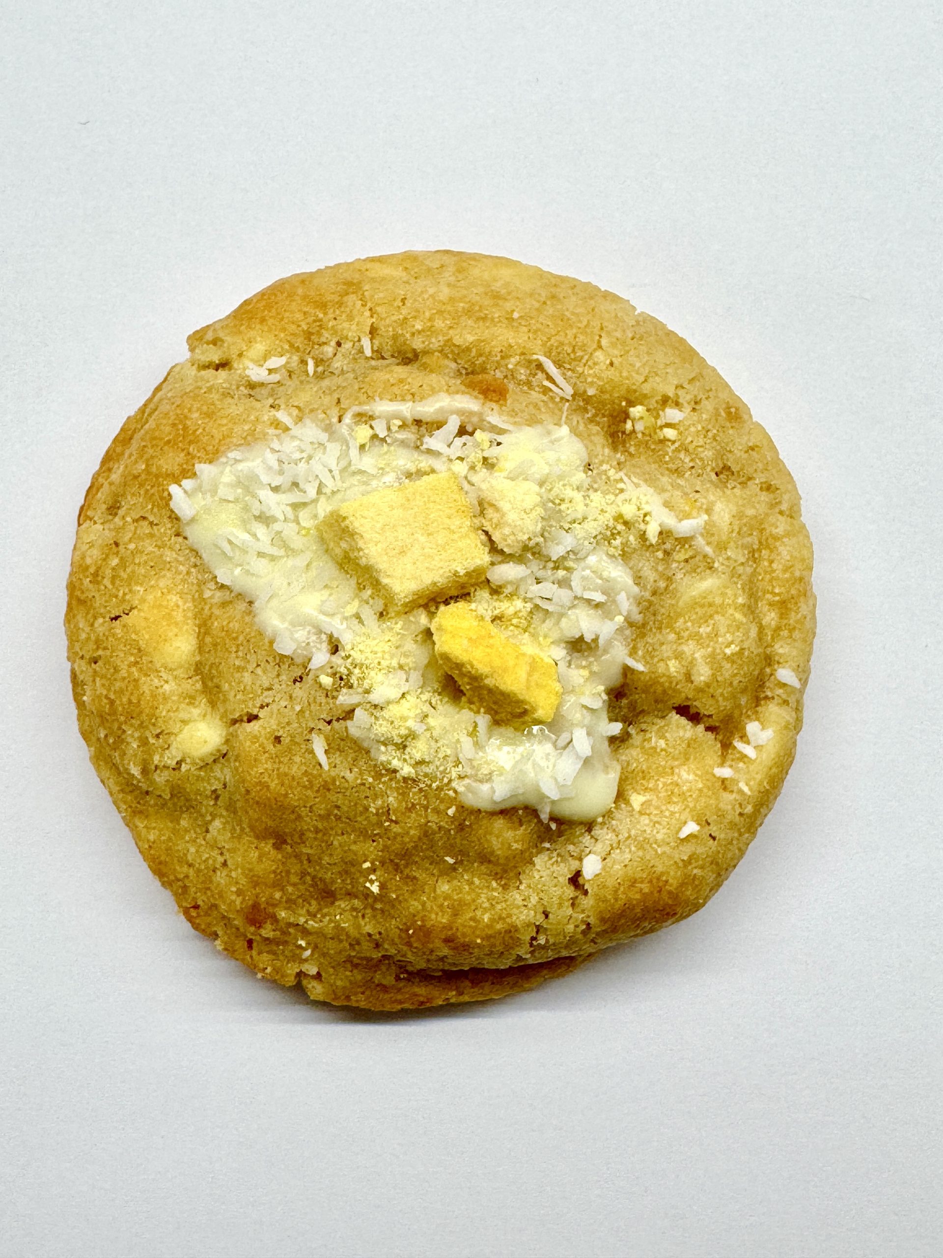 Jemné, vláčné těsto plné kvalitního kokosu, doplněné o bílou čokoládu a lyofilizované mango. Uvnitř vás čeká krémová mangová náplň z bílé čokolády, která celé cookiesce dodává svěží, lehce exotický nádech.