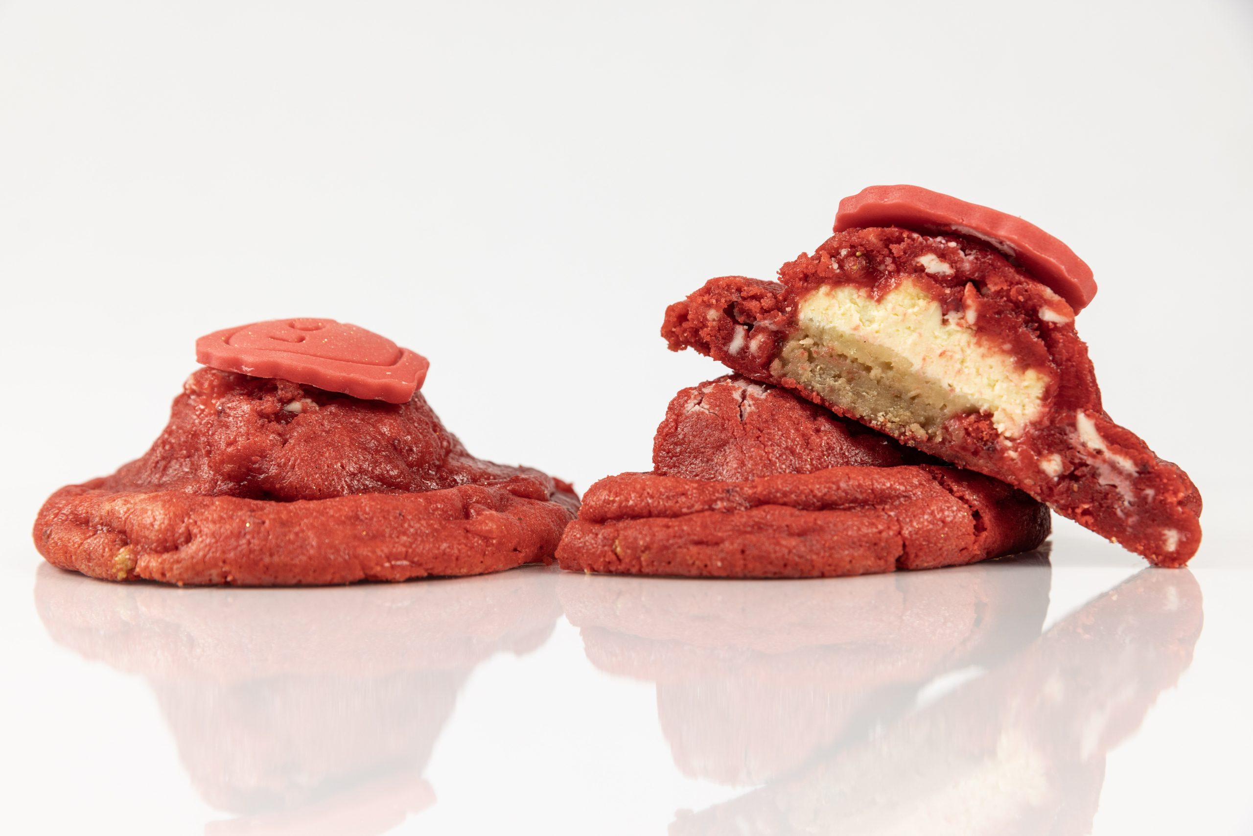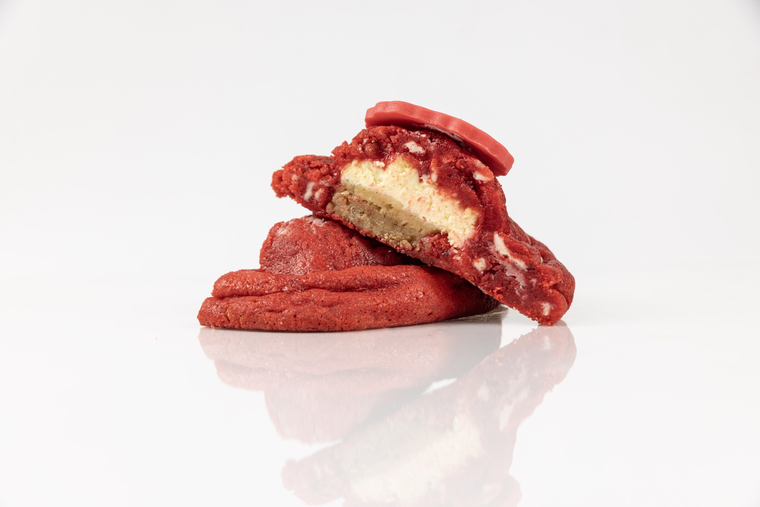 SLOŽENÍ: mouka, máslo, vejce, třtinový cukr, bílý cukr, vanilka, sůl, kypřící prášek, Fondán (cukr, glukózový sirup, pitná voda, rostlinné tuky (kokosový tuk, hydrogenovaný olej z palmových jader), modifikovaný bramborový škrob, zahušťovadlo: xanthanová guma, aroma, konzervant: sorban draselný, regulátor kyselosti: kyselina citronová), smetana (SMETANA, bakterie mléčného kysání.), tvaroh, Velvet bílá čokoláda, Ruby čokoláda, lyofilizovane jahody, lyofilizovane maliny, citron, zakysaná smetana, červené potravinářské barvivo (voda, sorbát draselný (E202), propylenglykol (E1520), barva (E124, E104)), potravinářský sprej s barevným efektem (E943a, E943b, E944, etanol, aroma, barvivo: E172. ), zlatý třpyt (protispékavá látka E555, barvivo E172) / Výrobek muže obsahovat stopy skořápkových plodů.