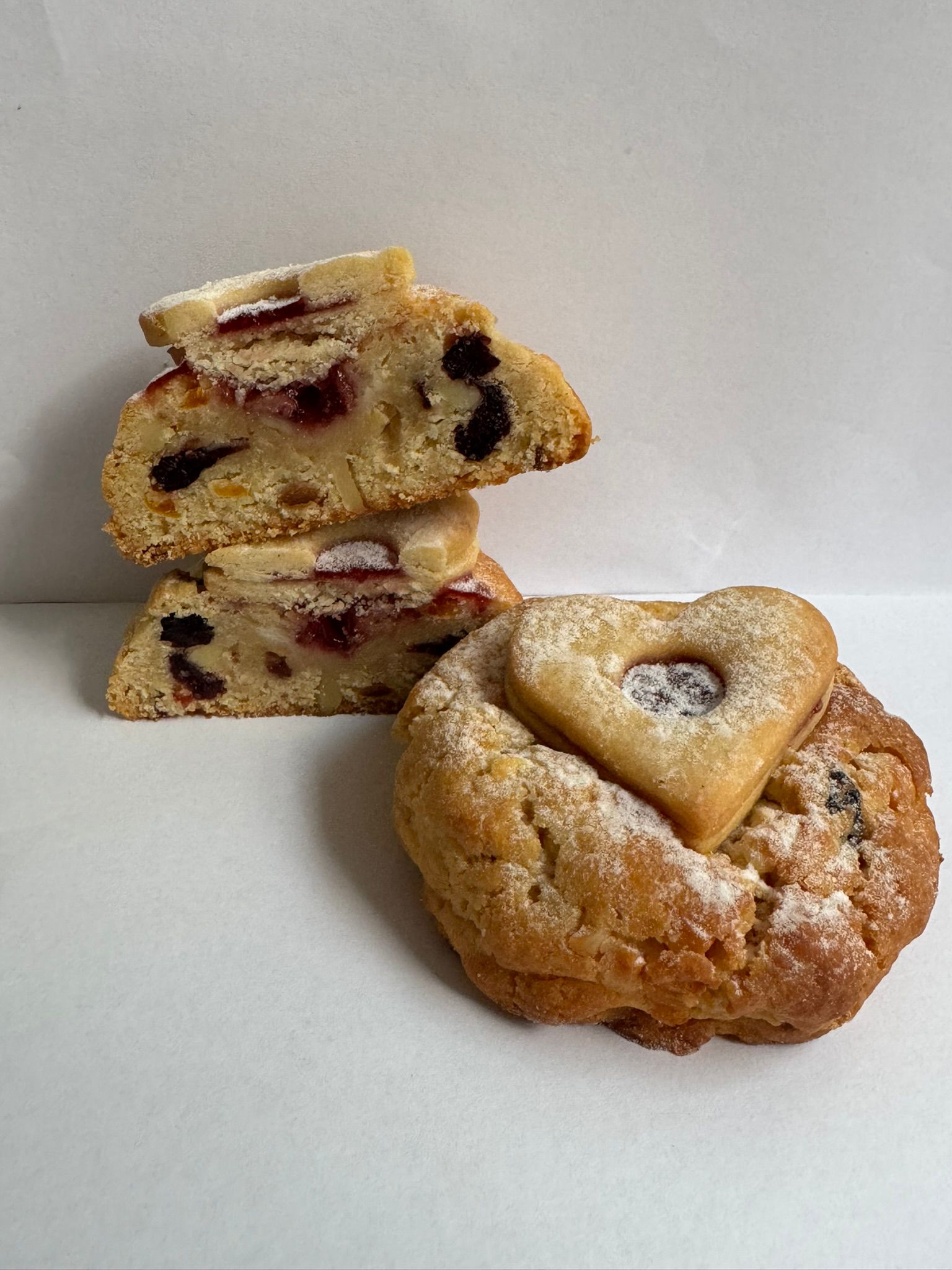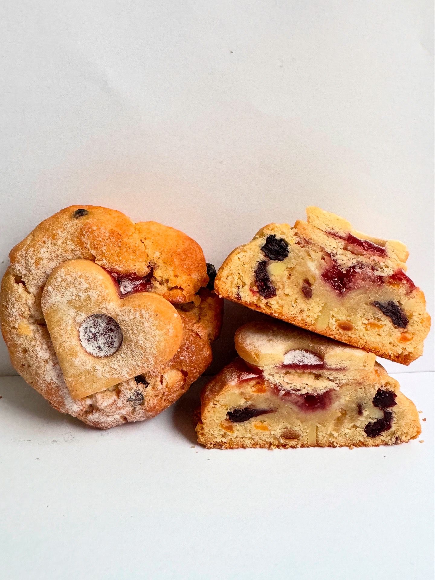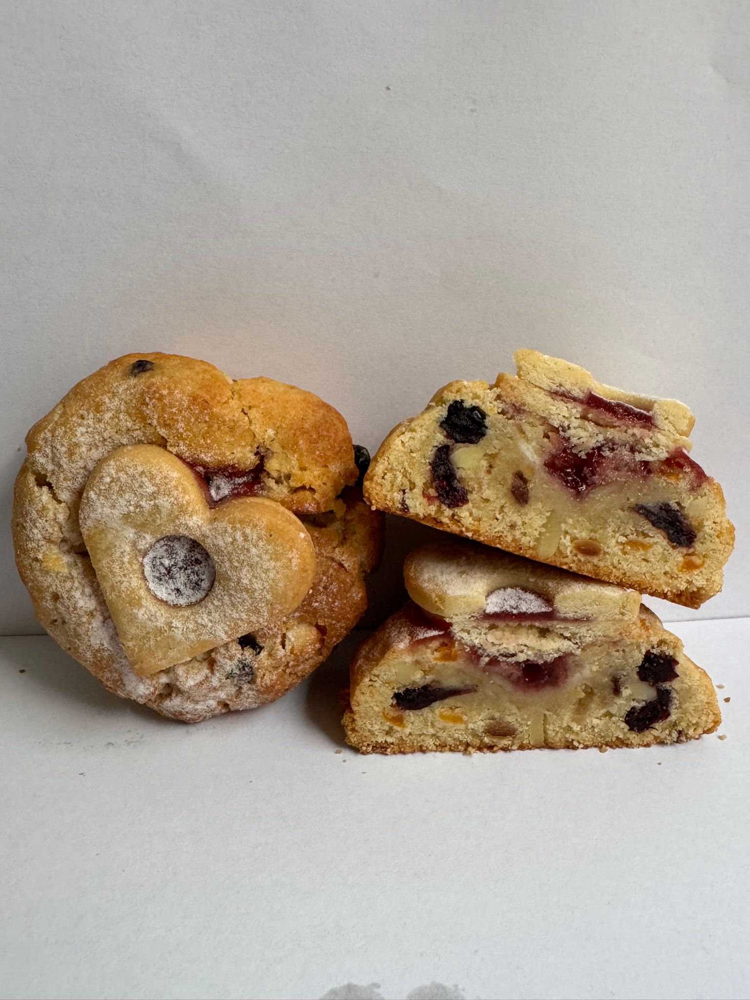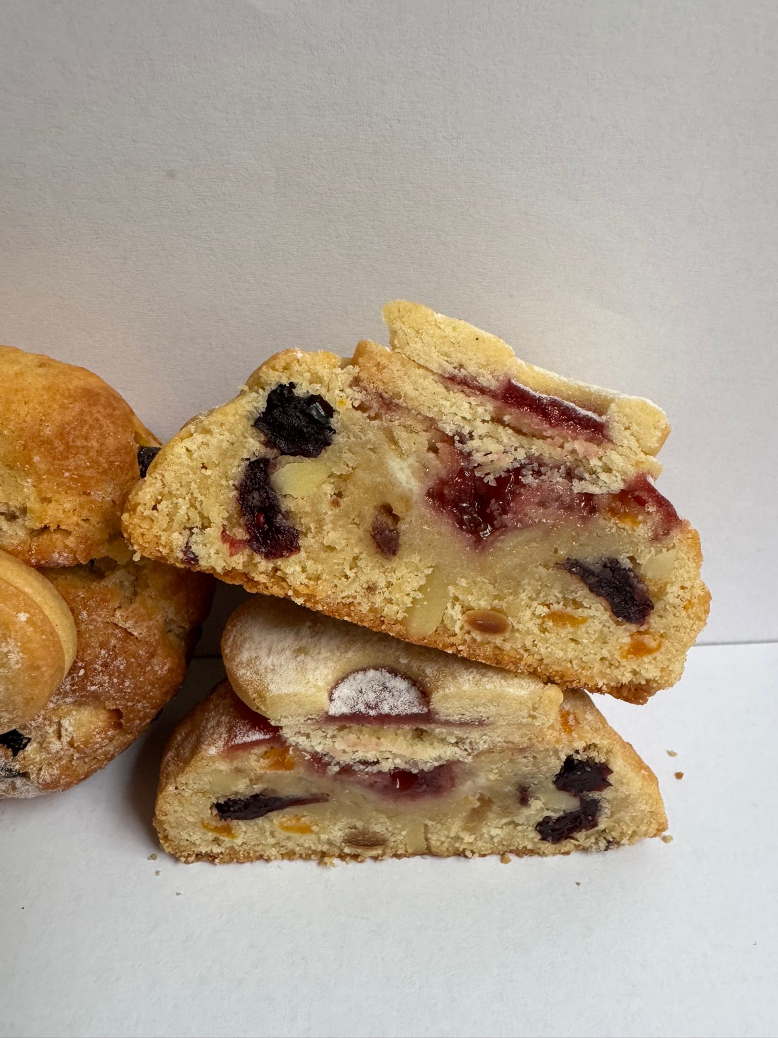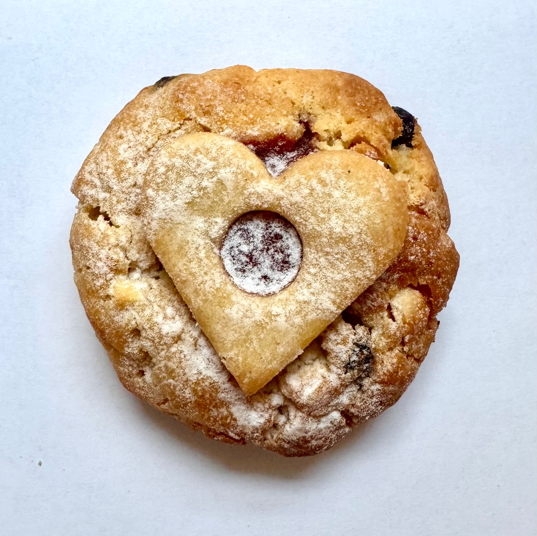 Poctivý mazanec v podobě cookiesky – vláčné těsto plné macerovaných meruněk a brusinek v rumu (24 hodin!), rozinek, mandlí, vanilky a citrusové kůry. Nahoře křupavá „suša“, uvnitř jemná marmeládová náplň, která to celé krásně propojí.